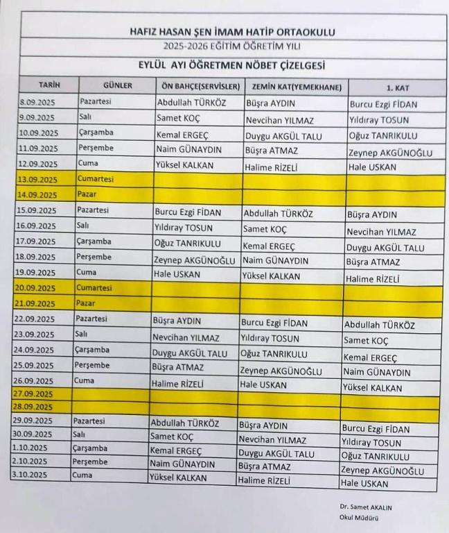 2025 2026 Eğitim Öğretim Yılı Öğretmen Nöbet Çizelgesi Eylül
